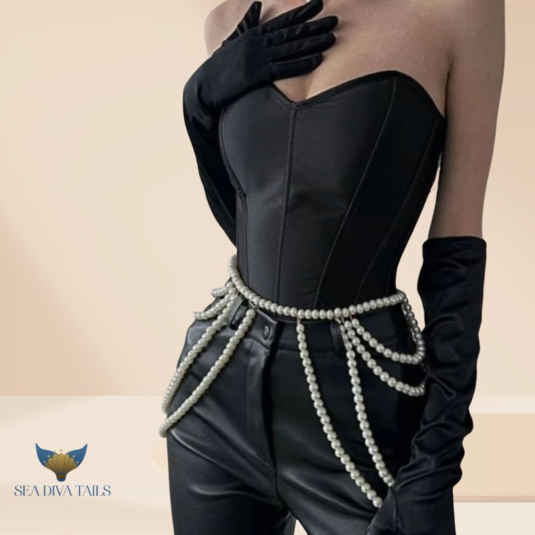 A pearl body belt with a tiered design resembling a pearl chain that elegantly wraps around the waist. Bringing a glamorous and sensual feel like a sea siren, this belt is a statement piece that immediately steals the spotlight. Made from high-quality imitation pearls with an elegant glossy finish, the Siren Belt pairs perfectly with dresses, corsets, or modern outfits for parties, fashion shows, or glam-themed photoshoots.