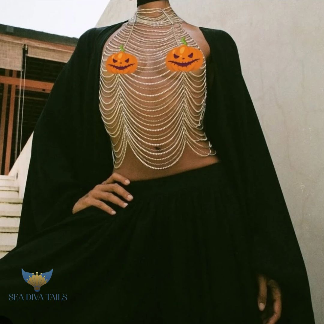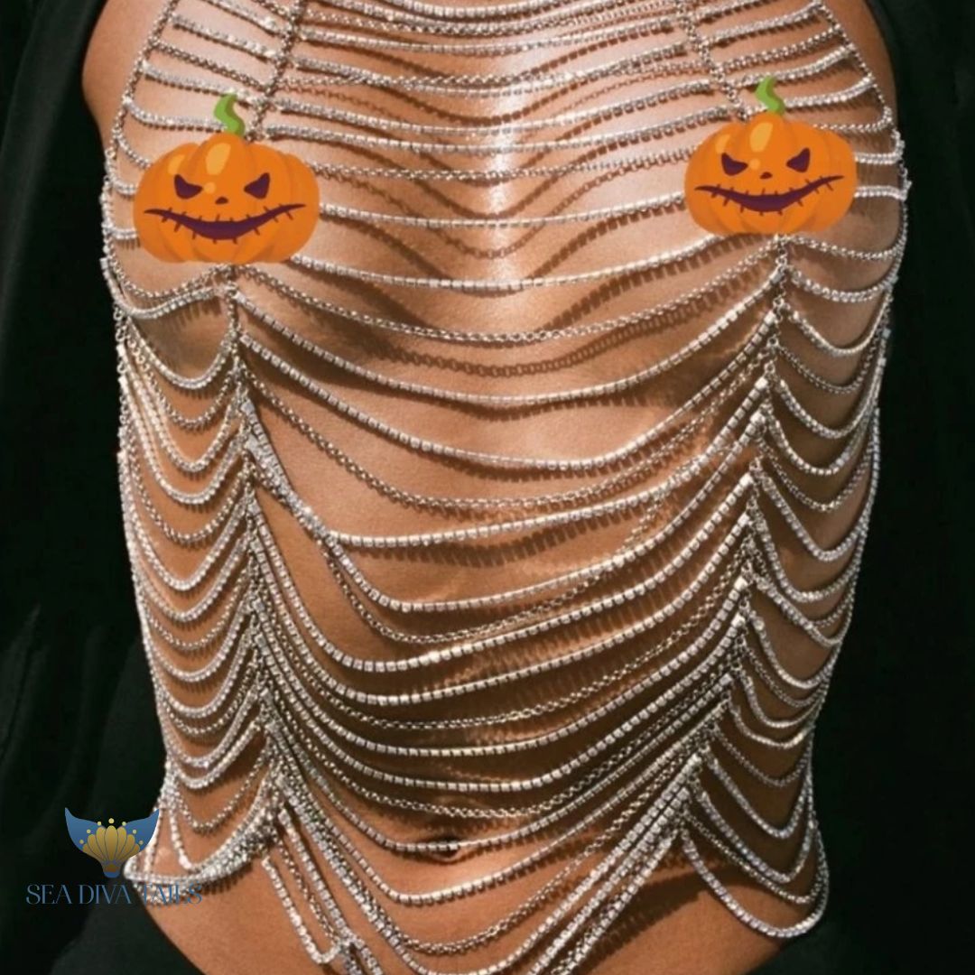 Crystal Storm is a rhinestone body chain with a tiered design that covers the front of the body. The sparkling crystal chain gives a luxurious and bold look, perfect for evening parties, fashion shows, clubwear, and stage performances.