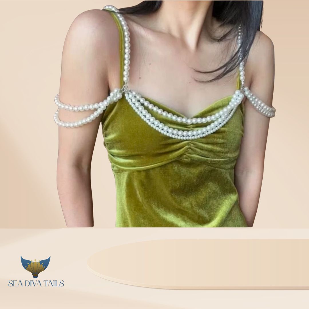 Mermaid Embrace Pearls is a body pearl accessory with a tiered design that gently wraps around the shoulders and arms. The high-quality synthetic pearls give an elegant look, perfect for parties, fashion shows, carnivals, and stage performances.