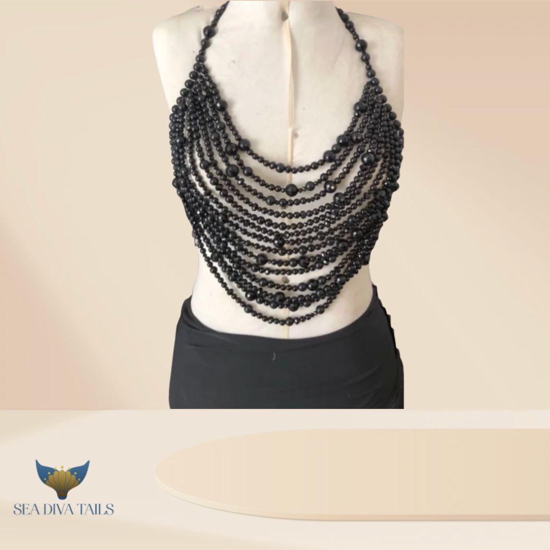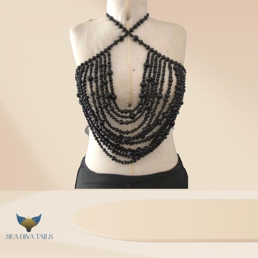 The Obsidian Flow Body Chain is a striking piece designed for bold expression. Made from cascading strands of jet-black faux pearls, it drapes elegantly across the body, creating depth, drama, and movement with every step. Perfect for performances, night events, or statement styling, this design channels the mystique of the deep sea and the confidence of a modern siren.
