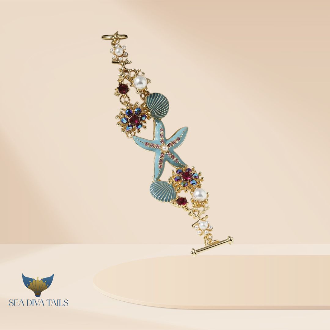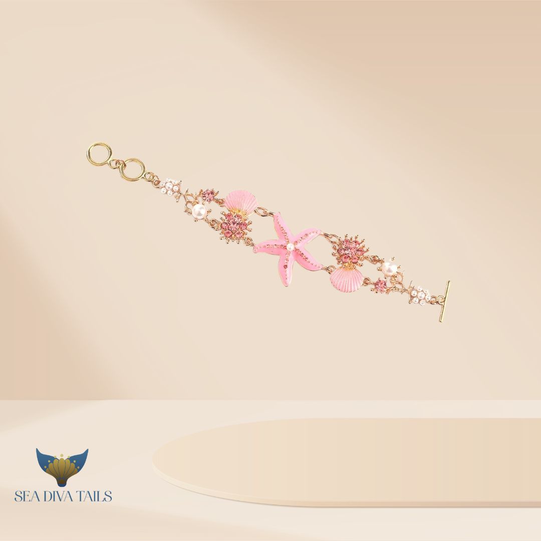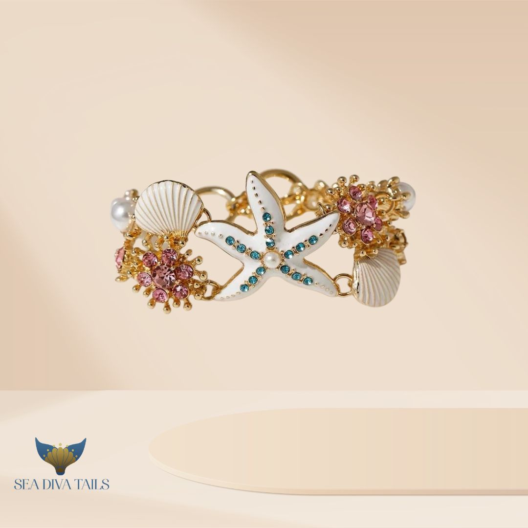 The Ocean Spark Series features a starfish, shell, and pearl design combined with beautiful colored crystals. Made from 100% titanium, this bracelet is rust-resistant, non-fading, non-tarnishing, and hypoallergenic, making it safe for everyday use, even when showering.