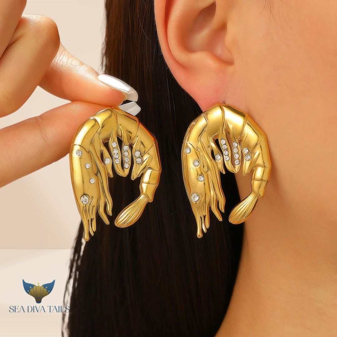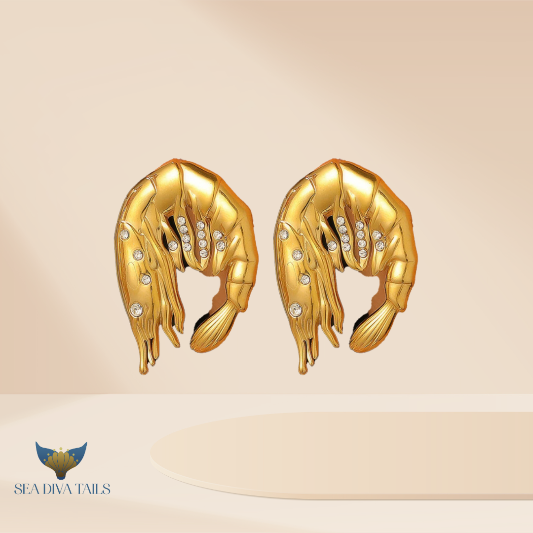 Gold shrimp-shaped earrings with sparkling crystal details. The design is bold, glamorous, and unique—combining a quirky side with a high-fashion feel. Perfect for those who want to stand out at parties, festivals, or simply be the center of attention. Aurum Prawn is not just an accessory, but a style statement.